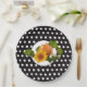 Elegante Erntedank-Papier-Teller mit weißen Polka-Punkte auf einem schwarzen Hintergrund und einem großen weißen Kreis mit einer schönen Sonnenblume und Kürbisbild, die sich aus dem Kreis ausbreiten. Es sind auch Matching-Elemente verfügbar. Leichte Reinigung!