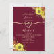 Vintage, elegante, weinbordeauxrote Hochzeitseinladung mit angesagter Kalligraphie-Schrift, Imitaten mit goldfarbenem Seil und wunderschönen Sonnenblumen. Die beste Wahl für schicke Hochzeiten im Herbst.