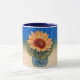 Sonnenblumen aus Single in einer klaren blauen Vase auf einem blau-goldenen Hintergrund.