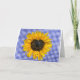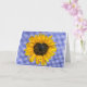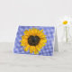Gelbe Sonnenblume mit herzförmiger Mitte und Ladybug auf blau-weißem Gingham zum Nachdenken.