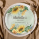 Elegante gelbe Sonnenblumen im Landstil und grüne Eukalyptus-Blätter sorgen für die individuelle Geburtstagsparty der Frau rund um die Teller auf Papier, personalisiert mit ihrem Namen und Party-Datum Perfekt für Ihre Sommer- oder Herbst Geburtstagsparty. Wählen Sie aus einer Vielzahl von Formaten und Formen. Kontaktieren Sie mich, um Hilfe bei der Anpassung zu erhalten oder um zusätzliche Matching oder Koordination von Zazzle Produkten für Ihr Party anzufordern.