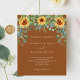 Ein brauner Hintergrund mit Sonnenblumen und Eukalyptusgrün. Personalisieren und fügen Sie Ihre Namen und Party-Details. 1 Blatt = 1 Einladung mit Druckkante bis Kante.
