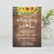 Elopement Hochzeitsfeier Einladung mit rustikalem Holzfußboden, Märchenleuchten und Sonnenblumen. Machen Sie es sich selbst, indem Sie Ihren Text (und Ihre persönlichen Fotos) hinzufügen. Um auf erweiterte Editierwerkzeuge zuzugreifen, gehen Sie bitte zu "Personalisieren", scrollen Sie nach unten und drücken Sie den Link "Weitere Anpassungen vornehmen". Für weitere passende Designs klicken Sie auf den Link "Andere Produkte aus dieser Kollektion".