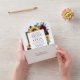 Das Design besticht durch elegante Aquarelltöne, Rose, Wildblumen und Sonnenblumen in verschiedenen Bordeaux-, Marineblau- und mehr über einen Kranz Eukalyptusgrün. Im Design befindet sich auch ein Holzrahmen unter dem Kranz. Ein einzigartiges Schriftart-Layout ergänzt das Gesamtdesign. Sehen Sie sich die Sammlung auf dieser Seite an, um passende Produkte für Hochzeitsbriefpapier und erweiterte Optionen zu finden. Ihre Gäste reißen die UAWG ab, wählen/essen und schicken sie als Postkarte zurück.