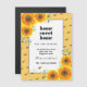 Gelber Hintergrund mit rustikalen, wasserfarbenen Sonnenblumen und glücklichen Hummeln. Mit dem Text: Zuhause Sweet Zuhause. Personalisieren Sie Ihre neue Adresse und Ihren neuen Namen.