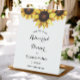 Sonnenblumen Probe Abendtisch Top Zeichen für Hochzeit mit gelben handbemalten Aquarellsonnenblumen auf weißem Hintergrund. Sie können auch für Hochzeiten, Verlobungen und Paare mit Dusche benutzen. Dieses Produkt ist Teil einer Kollektion, bitte Karo aus unserer Shop-Kollektion für passende Artikel.