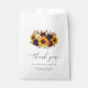 Sonnenblumenbeutel mit rustikalem Bouquet mit bemalten Sonnenblumen, rote Rosen, violetten Blumen und Grünpflanzen. Die Gastgeschenk Hochzeit ist mit Blumen und Blumen bepflanzt. Diese elegante Bevorty-Tasche ist ideal für eine boho themed Hochzeit im Herbst / Herbst.