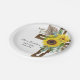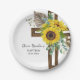 Schöne, fröhliche Sonnenblumen, Eukalyptus und Pampasgras, die auf einem dunklen Holzkreuz ausgestellt sind, schaffen dieses Blumendesign für Ihre Taufe-Teller. Die große Größe des Kreuzes schafft ein aktualisiertes Aussehen. Der Name und das Taufdatum werden ebenfalls auf dem Teller angezeigt. Diese Papiertafel ist perfekt für jede Spätsommer- oder Herbsttaufe.