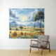 Diese Tapisserie hat eine Aquarelllandschaft, die ein Feld mit Sonnenblumen mit Bäumen und Bergen zeigt.