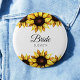 Die Brautknöpfe der Sonnenblume mit Blumenmotiv Gelbblütenfarben und Blautext auf weißem Hintergrund. Sie können dies zum Brautparty, zum Probe-Dinner, zum Paar Duschen, zur Verlobung und zum Empfang benutzen. Ändern Sie den Text mit dieser Vorlagenoption | Verwenden Sie weitere Optionen, um den Textstil und die Farbe bei Bedarf zu ändern. Dieses Produkt ist Teil einer Kollektion; daher Karo bitte unsere Kollektion für passende Artikel aus.