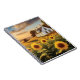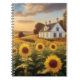 Ein weißes Bauernhaus liegt auf einem Hügel mit Blick auf ein weitläufiges Sonnenblumenfeld bei Sonnenuntergang mit sanften Hügeln im Hintergrund und schafft eine warme, idyllische Landschaft mit einer friedlichen Atmosphäre.