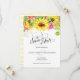 Sonnenblumen kaskadieren von der Oberseite der Save the Date Karte in Gelb mit Pop von Rosa und Grün. Auf der Rückseite der Karte befindet sich ein hellgelber Streifen-Hintergrund. Fügen Sie Ihre Hochzeitsdetails hinzu und Ihre Freunde und Familie werden Save the Date! Das passt zu einer Sammlung in meinem Geschäft.