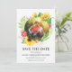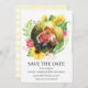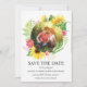 Ein wunderschöner Sonnenblumenkranz mit Pop von rosa Akzent Blume und Grün umrahmt Ihr Save the Date Foto. Fügen Sie Ihre Daten und Foto hinzu. Die Rückseite der Karte ist mit blassgelben Streifen in Aquarellfarben dekoriert.
