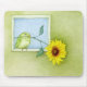 Farbige Bleistift-Abbildung eines niedlichen kleinen Vogels, der in einem Fenster einer grünen Wand sitzt und eine Sonnenblume in seinem Schnabel hält. Ein schönes Geschenk für den Muttertag, vielen Dank, einen Geburtstagsgruß oder für jeden anderen besondere Anlass. Auch schöne passende Karten, Postkarte, Briefmarke, Aufkleber, Magnet, Tasse, Beutel, T - Shirt, Poster.