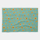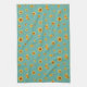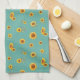 Küchentuch mit Sonnenblumen. Gelbe Blumen und Salbeigrün gestalten ein sonniges Muster auf türkisblauen Handtüchern.