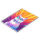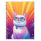 Eine coole weiße Katze mit stilvollen Sonnenbrillen sitzt selbstbewusst vor einem pulsierenden Regenbogenbruch. Das kurze, unberührte Fell der Katze verleiht ihrer Haltung und Coolness eine besondere Note und ergänzt den dynamischen und farbenfrohen Hintergrund.