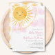 Planen Sie eine Babydusche zum Thema Sonne? Diese niedliche Sonnenscheinsdusche-Einladung enthält den Text "Unser kleiner Sonnenstrahl ist fast hier!" mit einer Aquarellfarbe, die gelbe Sonne und rosa Wolken lächelt. Die Rückseite ist mit einem Sonnenmuster dekoriert. Einfach anpassbar. Original Wasserfarbe © Michele Davies.
