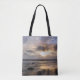 Ein fotografisches Design eines sanften, traumhaften Sonnenuntergangs über dem Meer und reflektiert sich im Wasser auf dem Strand. Wales.