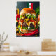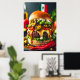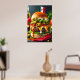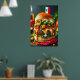 Mit diesem Sonora Spice Bomb Burger können Sie sich auf eine Geschmacksexplosion vorbereiten. Eine dicke, würzige Rindfleischpartie, gegrillt bis zur süßen Perfektion, wird mit geschmolzenem Oaxaca-Käse, gebratenem Jalapeños, einem großzügigen Abstrich aus Chipotle Mayo und frischem Avocado überragt. Alle sind in einem toasted Maisknochen eingebettet. Eine kleine mexikanische Fahne sorgt für eine festliche Touch, während ein verschwommener Hintergrund auf Paprikaschoten am Chili und auf frischem Ciclantro hindeutet, was diese mexikanische kulinarische Köstlichkeit ergänzt.