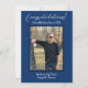 Dunkelblauer Abschluss Foto Ankündigungskarten. Dieses einfache Design wurde für den Abschluss eines Sohnes entworfen und bietet ein Portrait-Foto mit "Herzlichen Glückwunsch" mit Namen und Klassenjahr an der Spitze. Ein dünner schwarzer Rahmen umgibt sein Foto. Eine weitere hellgraue Textvorlage am unteren Rand ist für den Schulnamen und den Schulort. Das Gegenteil ist massiv blau. Kaufen Sie als gedruckte Karte, oder Download, oder beides.