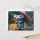 Une petite souris joyeuse est sous la pluie avec un grand parapluie. On voit partout des gouttes de pluie, des flaques et des reflets colorés.