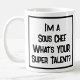 Ein sonniger Slogan auf einer Tasse, die sagt: "Ich bin ein Sous Koch. Was ist DEIN super Talent?" Kaffee Tasse für einen Sous Koch. Schwarzweißtext.