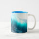 Une vague massive saute des mers agitées, brillant blanc et bleu et turquoise dans la lumière du soleil. Sous la vague, sur le point d'être submergée, se trouve une petite ville avec un château et des cottages médiévaux construits sur un promontoire rocheux.