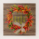 Personalize this puzzle with your own text or you can remove the text, or change the text colors if desired. My design features a colorful chile pepper ristra wreath tied with a raffia bow on a weathered background. My original painting was inspired by the chile ristras and wreaths I hung at my home in New Mexico. Ristras are a symbol of welcome said to bring good health and good luck.