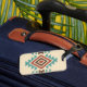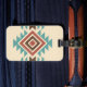 A Southwestern-style geometric pattern featuring layered diamond shapes in warm terracotta, deep brown, and cool turquoise tones. The distressed texture gives it a vintage feel, while the symmetrical layout adds a clean and modern touch.