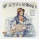 Illustration vintage d'une jeune femme assise sur un banc, tenant un chien enveloppé dans une couverture avec le titre "Be Kind to Animals" L'illustration est de Morgan Dennis et a été distribuée par le State Humane Office de Madison Wisconsin