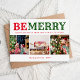 Cartes photo de Noël magnétiques personnalisées abordables avec un modèle simple pour la personnalisation. Ce joli design festif présente une typographie audacieuse BE MERRY en vert et rouge. Le message ci-dessous dit "Joyeuses fêtes de notre famille à la vôtre". Personnalisez-le avec 3 photos de famille, vos noms et l'année. Utilisez les outils de conception pour choisir des couleurs arrière - plans, modifier les polices de texte et les couleurs ou ajouter des photos pour créer une carte photo unique d'un genre.