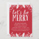 Une invitation festive de fête rouge et blanche. L'expression "Soyons joyeux" est écrite dans une typographie ludique et rustique, avec des baies et des feuilles saints encadrant l'invitation.