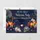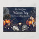 Éffrayante invitation de carte postale Halloween avec citrouilles, bougies, chat noir, crâne, poupée effrayante, visage clown effrayant, sorcière et pleine lune.