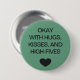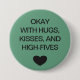 Sozialer distanzierender, farblich gekennzeichneter grüner Knopf, der Ihnen hilft, sich sicher und komfortabel mit Ihren sozialen Interaktionen zu fühlen, und lasse anderen zu wissen, mit welchem Maß an sozialer Distanz Sie sich wohl fühlen. Der Text lautet "OKAY WITH HUGS, KISSES, AND HIGH-FIVES". In meiner Sammlung "Soziale Distanz, Gesichtsmaske und Sanierungsstationen" sind passende Artikel und Unterrichtszeichen verfügbar. Für weitere Personalisierungen oder Sonderanfertigungen, kontaktieren Sie mich bitte unter acherryonthecake@hotmail.com (bitte 1-2 Arbeitstage).