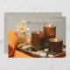 Un design élégant avec une serviette roulée et un plateau avec trois bougies éclairées et des rochers de rivière. Une branche de cymbidiums crémeux orne le plateau. (PB)