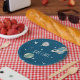 Niedliche Geburtstag Papier Teller mit einem Galaxiethema. Das Bild zeigt einige Planeten und blaue Sterne. Die Abbildung sieht aus, als wäre sie in drei Dimensionen, aber das ist nur ein Druck. Illustriert und entworfen von Patricia Alvarez.