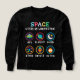 Playful space themed artwork made for curious kids and young students. Cute symbols like UFO, planet, moon, stars, rocket and alien help children explore space science and basic astronomy in a fun and friendly way.
