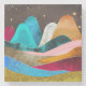 A vibrant, textured digital illustration featuring rounded fantasy mountains set against a dark sky full of golden stars. The style is modern and abstract, with a heavy emphasis on color contrast and layered textures.