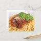 Spaghetti-Bolognese-Teller mit geriebenem Käse und mit italienischer Großblattbasilikel geschmückt