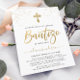 Moderner, eleganter Junge Bautizo Einladung mit weißem und goldenem Hintergrund, elegantem Goldkreuz, Typografie-Schrift Taufe in trendigem Schriftsatz. Um diese Vorlage zu bearbeiten, klicken Sie auf Weitere Anpassung.