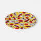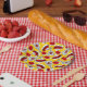 Ein Design im Stil der Mitte des Jahrhunderts mit einer Retro-Touch mit Souvenirs aus einem spanischen Urlaub; eine schmiedeeiserne Gitarre, ein lakiger Ventilator und eine rote Rose auf goldgelbem Hintergrund. Ein individuell anpassbares Design für Sie, um mit Ihrem eigenen Text, Bildern und Ideen zu personalisieren. Ein digitales Kunstbild, erstellt von Jess Perry bei QuirkyChic Retro