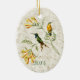 Zwei grüne Kolibris, einer mit blauem Hals und der andere mit hellgelber Brust, Erholung auf einer gelb-orangefarbenen Trompetenrebe, auf einem hellen, goldgelben Marmorboden. Personalisierungsoptionen auf Vorder- und Rückseite, oder Textentfernen für eine elegante naturlich inspiriert Ergänzung zu jedem Weihnachtsbaum. Perfekter jeden Anlaß für Liebhaber von Kolibri.