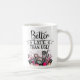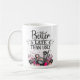 Spaß selbst-ironische Kaffee-Tasse, mit dem Titel "Besser spät als hässlich", in schwarz-modernen Typografie, mit einer schönen Illustration von kosmetischen Produkten verziert.