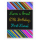 Dieses lustige, farbenfrohe und skurrile Geburtstagskarten-Design mit einem warmen Geburtstagswunsch wie "Haben Sie einen großen 67. Geburtstag, Vorname!" vorne. Der Name auf der Vorderseite kann angepasst werden. Oben und Unterseite der Vorderseite zeichnen sich durch lebhafte, bunte Streifen aus. Im Inneren befindet sich eine Geburtstagsnachricht, die personalisiert werden kann. Eine solche Grußkarte könnte eine lustige Art sein, jemandem, der seinen siebenundsechzigsten Geburtstag feiert, Geburtstagswünsche zu geben. [~Z0000269]