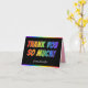 Dieses positive Dankeschön, das Sie beim Kartendesign begrüßen, enthält die Meldung "DANKE DICH SO VIEL!", wobei die Buchstaben ein inspiriertes Farbverlaufsmuster haben. Im Inneren gibt es eine personalisierte Danksagung. Eine solche Karte könnte dazu verwendet werden, jemandem zu danken, der etwas Besonderes getan hat oder vielleicht an einer Veranstaltung wie einer Hochzeit, einem Jubiläum-Party oder einer Geburtstagsparty teilgenommen hat.