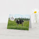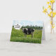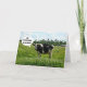 Schwarz-Weiß-Kuh stehend auf der Weide, mit einem kleinen humorvollen Sprichwort: "Ich bin hervorragend in meinem Feld!"