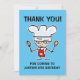 Spaß Kind's Backthema Geburtstag Party danke Ihnen Karte. Ideal für Kinderfeiern in der Küche. Fügen Sie Ihren eigenen Text und Ihre eigene Hintergrundfarbe hinzu. Funny Koch Cartoon zeichnend mit dem Hut des Kochs und der roten Schürze mit einem Whisk und Holzlöffel.