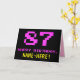 Die Vorderseite dieses lustigen, geeky und nerdy Geburtstag Thema Grußkarte Design bietet eine große Zahl "87" und die Nachricht "HAPPY BIRTHDAY", farbig pink, zusammen mit einem kühnen gelben benutzerdefinierten Empfänger Namen. Der Text weist ein Erscheinungsbild auf, das durch das 8-Bit-Retro-Design von Computer-/Videospielgrafiken aus den 1970er und 1980er Jahren inspiriert wird, und der Hintergrund ist schwarz. Die Innenseite verfügt über eine benutzerdefinierte Geburtstagsgrüßbotschaft oder könnte gelöscht und leer verlassen werden, wenn eine Nachricht von Hand geschrieben werden soll. Eine alberne, anpassbare Geburtstagskarte wie diese könnte eine lustige Art sein, jemandes siebenundachtzigsten Geburtstag anzuerkennen. [~Z0000478]