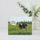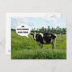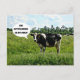 Schwarz-Weiß-Kuh stehend auf der Weide, mit einem kleinen humorvollen Sprichwort: "Ich bin hervorragend in meinem Feld!"