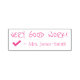 Dieses motivierende Gummi Briefmarke Design beinhaltet die inspirierend Feedback-Nachricht "SEHR GUTE ARBEIT!" und den Namen eines Lehrers oder Lehrers. Es verfügt auch über ein dekoratives Auswahlfeld. Es könnte von einem Lehrer, Pädagogen, Ausbilder oder Tutor verwendet werden, um anzuzeigen, dass der Schüler eine großartige Arbeit geleistet hat.